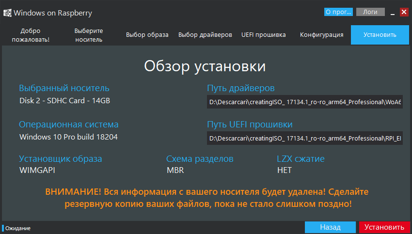 [WoR lang file] Lang.IsOutdated=1 WindowTitle=Windows on Raspberry LoggerWindowTitle=Логи AboutWindowTitle=О программе AppVersionLabel=Версия CreditsPage=Благодарность ChangelogPage=Изменения LicensesPage=Лицензирование LicenseAgreementWindowTitle=Лицензионное соглашение AcceptBtn=Принять DeclineBtn=Отклонить WelcomePage=Добро пожаловать! WelcomeLabel=Добро пожаловать в Windows on Raspberry Imager! WelcomeMsgTextBox=WoR (Windows on Raspberry) - это инструмент, который поможет установить Windows на ARM(полная версия, не IoT) на Вашу SD карту для использования на Raspberry Pi 3B/3B+. SelectLangLabel=Выберите ваш язык: NextPageBtn=Далее BackPageBtn=Назад SelectDiskPage=Выберите носитель SelectDiskLabel=Выберите носитель SelectDiskMsg=Примечание: Даже если новый драйвер USB стабилен, загрузка с устройства USB не рекомендуется, поскольку Windows не может создать на нем файл подкачки. DiskInfoBox.AtLeast8=Выберите носитель должна иметь, хотя бы, 8 ГБ свободного места! DiskInfoBox.Good=Выбранный носитель подходит. DiskInfoBox.Enough=Выбранного носителя хватит, чтобы установить сжатый образ. SelectImagePage=Выбор образа SelectImageLabel=Выберите ваш Windows ARM образ WindowsEditionLabel=Windows edition: WorkingBuildsTextBox=Примечание: Windows 10 1803 и более новые версии, как известно, работают.%n%Версия 1809 может неожиданно произойти сбой из-за некоторых изменений в драйвере WppRecorder.sys, так что эго следует избегать. SelectImgInfoBox.SelectedImageGood=Выбранный файл образа (версия: %1) подходит! SelectImgInfoBox.SelectedImageInvalid=Выбранный файл не подходит в роли образа Windows! SelectImgInfoBox.SelectedImageUnsupported=Выбранный образ не поддерживается! SelectDriversPage=Выбор драйверов SelectUEFIPage=UEFI прошивка ConfigurationPage=Конфигурация FinishPage=Установить SelectDriversLabel=Выберите драйвера DriversNoteTextBox=Примечание: драйвера должен быть упакованы в ZIP формате. NoDriversTextBox=Вы можете получить последнюю версию рабочих драйверов здесь: SelectDrvInfoBox.OK=Архив драйверов подходит! SelectDrvInfoBox.LicenseNotAccepted=Вы не приняли одно из лицензионных соглашений! SelectUEFILabel=Выберите UEFI прошивку UEFINoteTextBox=Примечание: UEFI прошивка должна иметь расширение файла %2 GetUEFITextBox=Вы можете получить последнюю версию Raspberry Pi UEFI прошивки отсюда: Message.AnErrorOccurred=Произошла ошибка! Пожалуйста, проверьте логи. Message.TaskOngoing=В данный момент выполняется операция.%n%Вы уверены, что хотите принудительно закрыть приложение? ConfigurationLabel=Конфигурация InstallOptionsGroup=Опции установки PartSchemeLabel=Схема разделов: ImgInstallLabel=Установить образ через: EnableLZXCheck=Включить LZX сжатие BootOptionsGroup=Опции запуска WoROptionsGroup=Настройки WoR SaveConfigExitLabel=Сохранить эту конфигурацию при выходе InstallOverviewLabel=Обзор установки InstallInfoBox.Warn=ВНИМАНИЕ! Вся информация с вашего носителя будет удалена! Сделайте резервную копию ваших файлов, пока не стало слишком поздно! InstallInfoBox.Time=Этот процесс может занять длительное время, в зависимости от производительности носителя. TargetDeviceLabel=Выбранный носитель OSLabel=Операционная система DriversPathLabel=Путь драйверов UEFIPathLabel=Путь UEFI прошивки PartitionSchemeLabel=Схема разделов ImageDeployerLabel=Установщик образа LZXCompressionLabel=LZX сжатие LZXCompression.YES=ДА LZXCompression.NO=НЕТ NextPageBtn.Install=Установить NextPageBtn.Finish=Завершить InstallStatusLabel.GettingReady=Ожидайте . . . InstallStatusLabel.FormattingDisk=Форматирование выбранного носителя . . . InstallStatusLabel.CreatingPartitions=Создание разделов . . . InstallStatusLabel.InstallingWindows=Устанавливается Windows . . . InstallStatusLabel.InstallingBootFiles=Устанавливаются файлы запуска . . . InstallStatusLabel.InstallingDrivers=Устанавливаются драйвера . . . InstallStatusLabel.InstallFinished=Установка завершена! InstallStatusLabel.InstallFailed=Установка прервана! StatusBar.Idle=Ожидание StatusBar.LoadingDisks=Загрузка драйверов . . . StatusBar.MountingISO=Монтирование ISO образа . . . StatusBar.UnmountingISO=Размонтирование ISO образ . . . StatusBar.Extracti